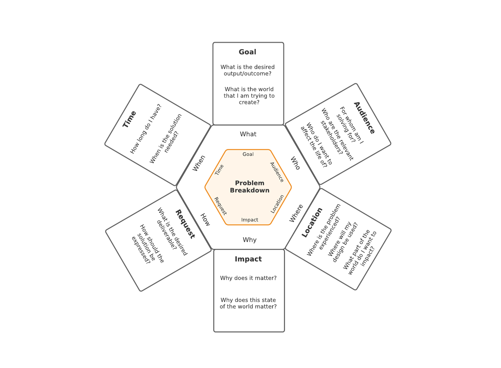 In order to understand the problem, I used my hexagon-shaped problem framing framework to help me identify key touchpoints regarding the problem my client wanted to solve and what the outcome of the product should be.